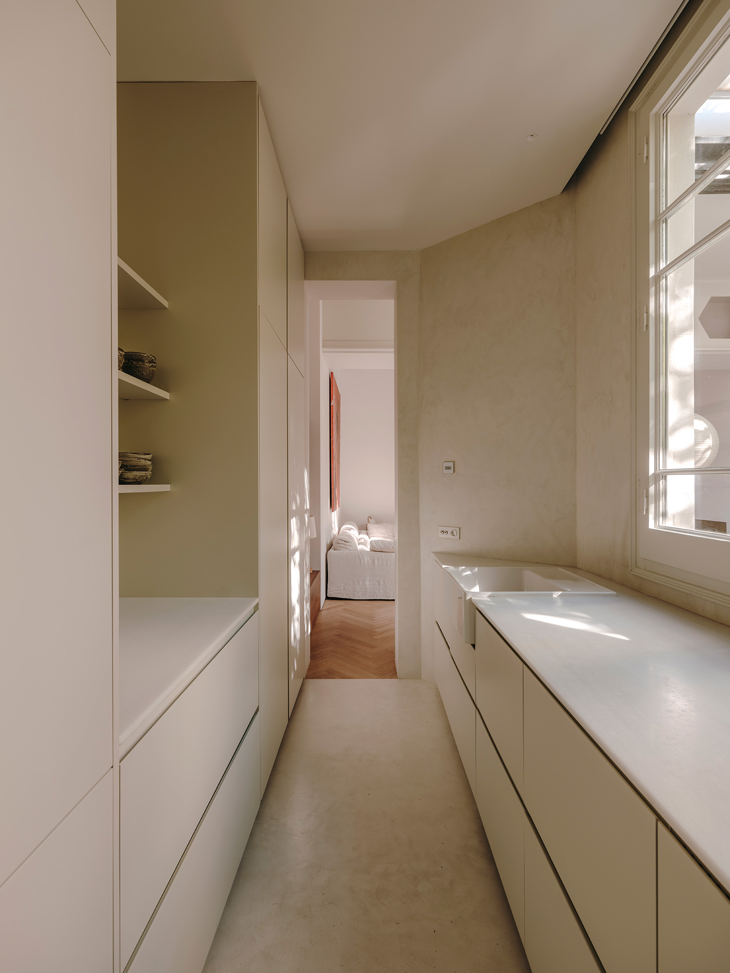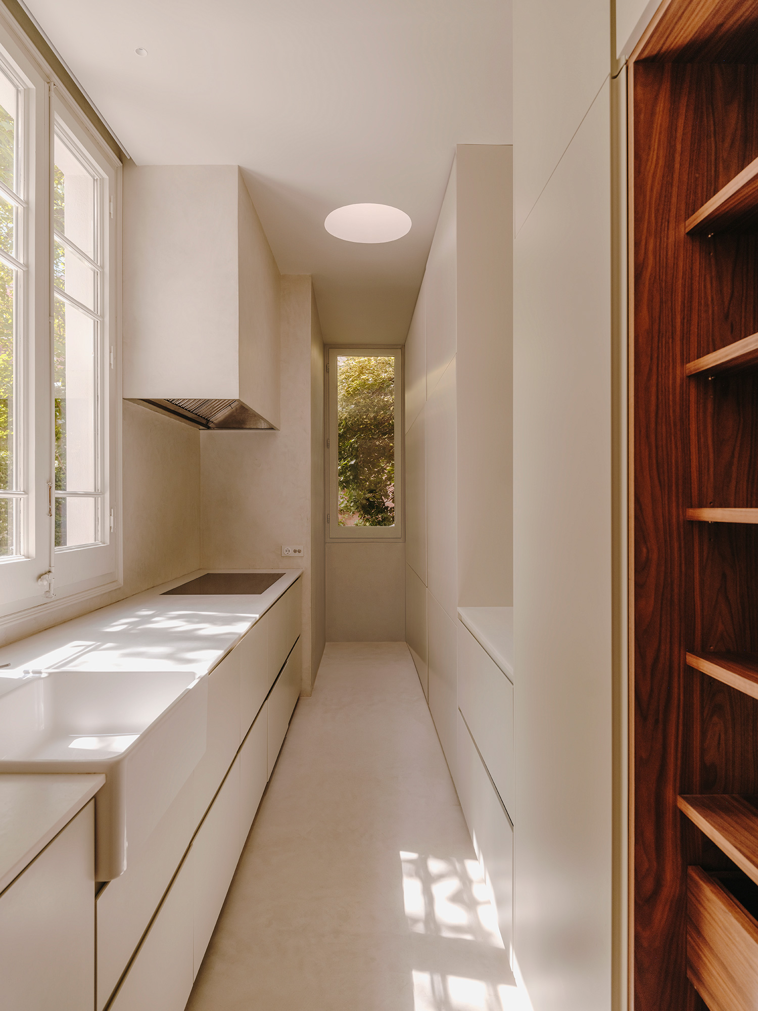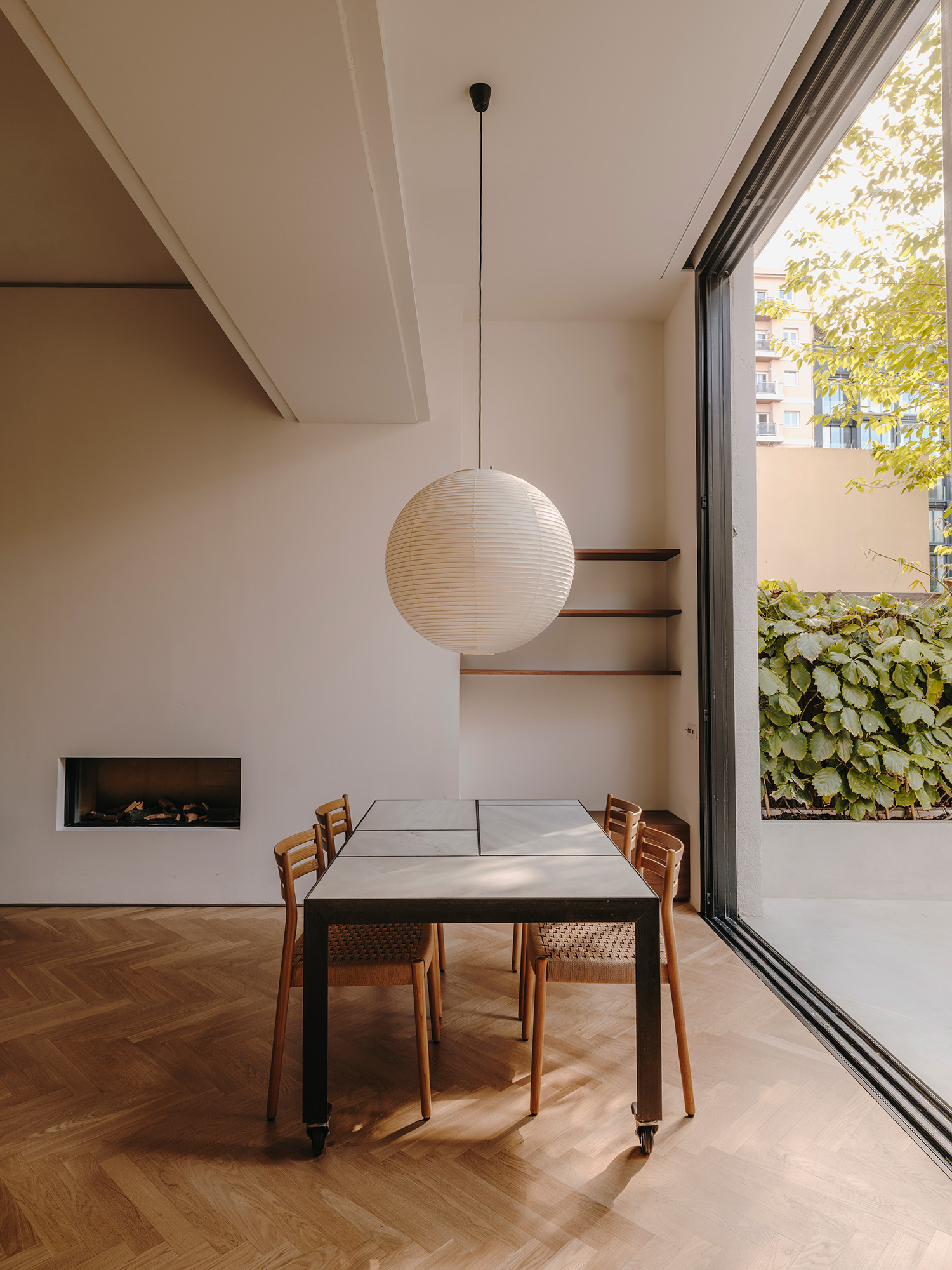 Se ubica en una zona densificada, al tratarse de una planta baja, el proyecto ha potenciado la entrada de luz natural: se han aprovechado los casi cuatro metros de altura de la vivienda, se han colocado grandes ventanales en la zona de día y el dormitorio colindante a la calle y se han creado aberturas en el pasillo, la zona menos favorecida lumínicamente.