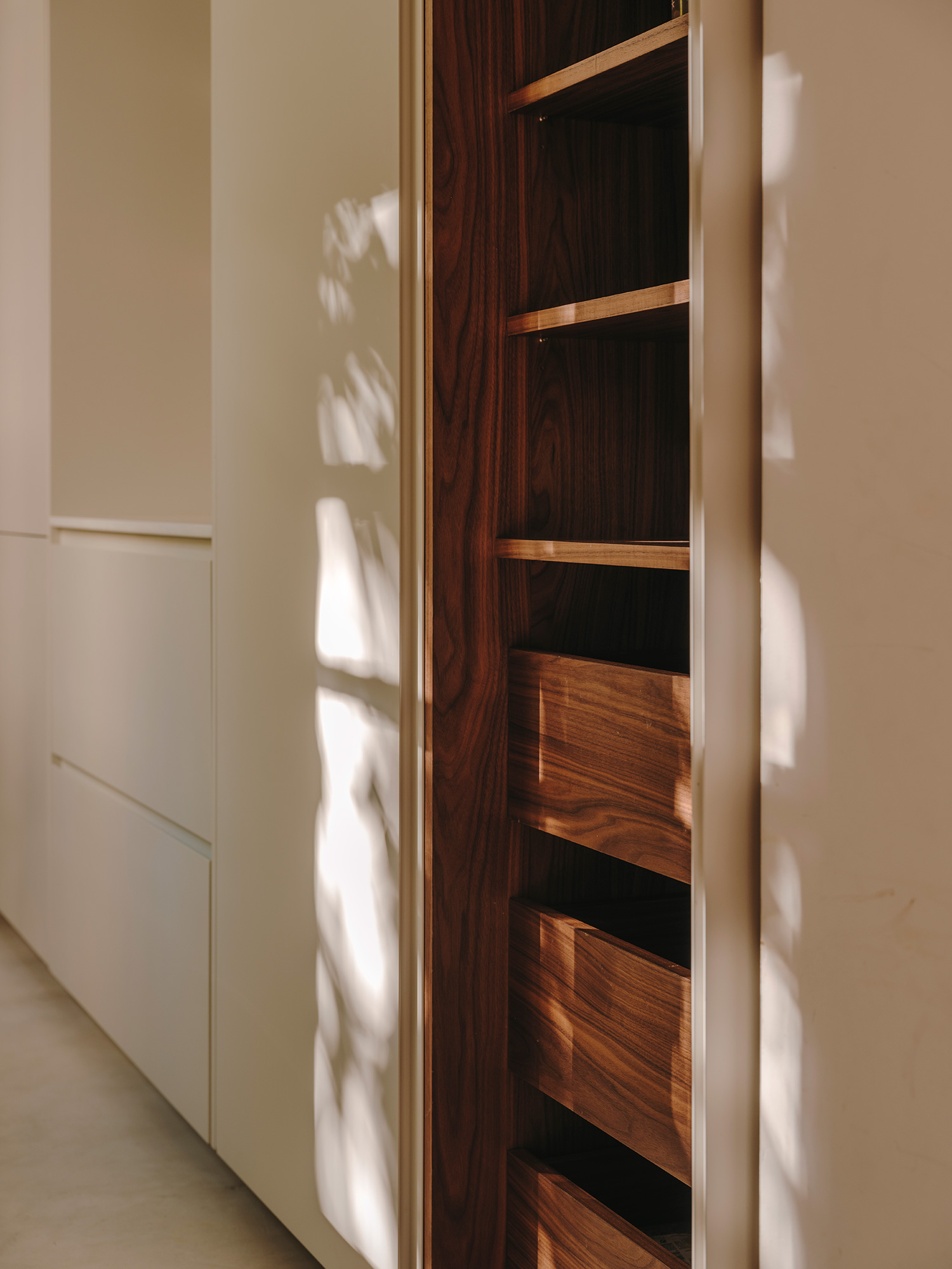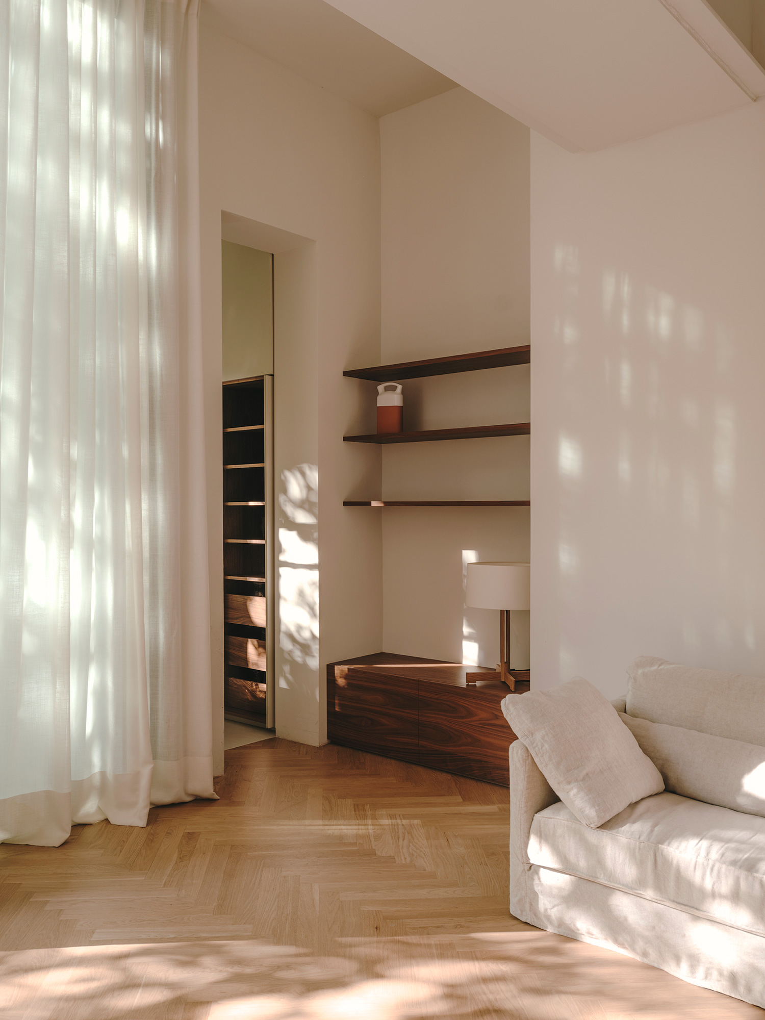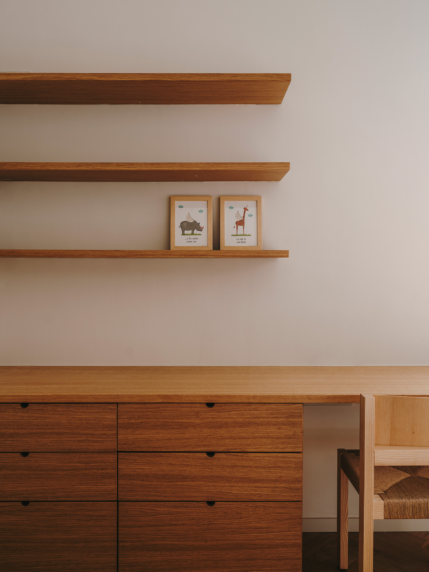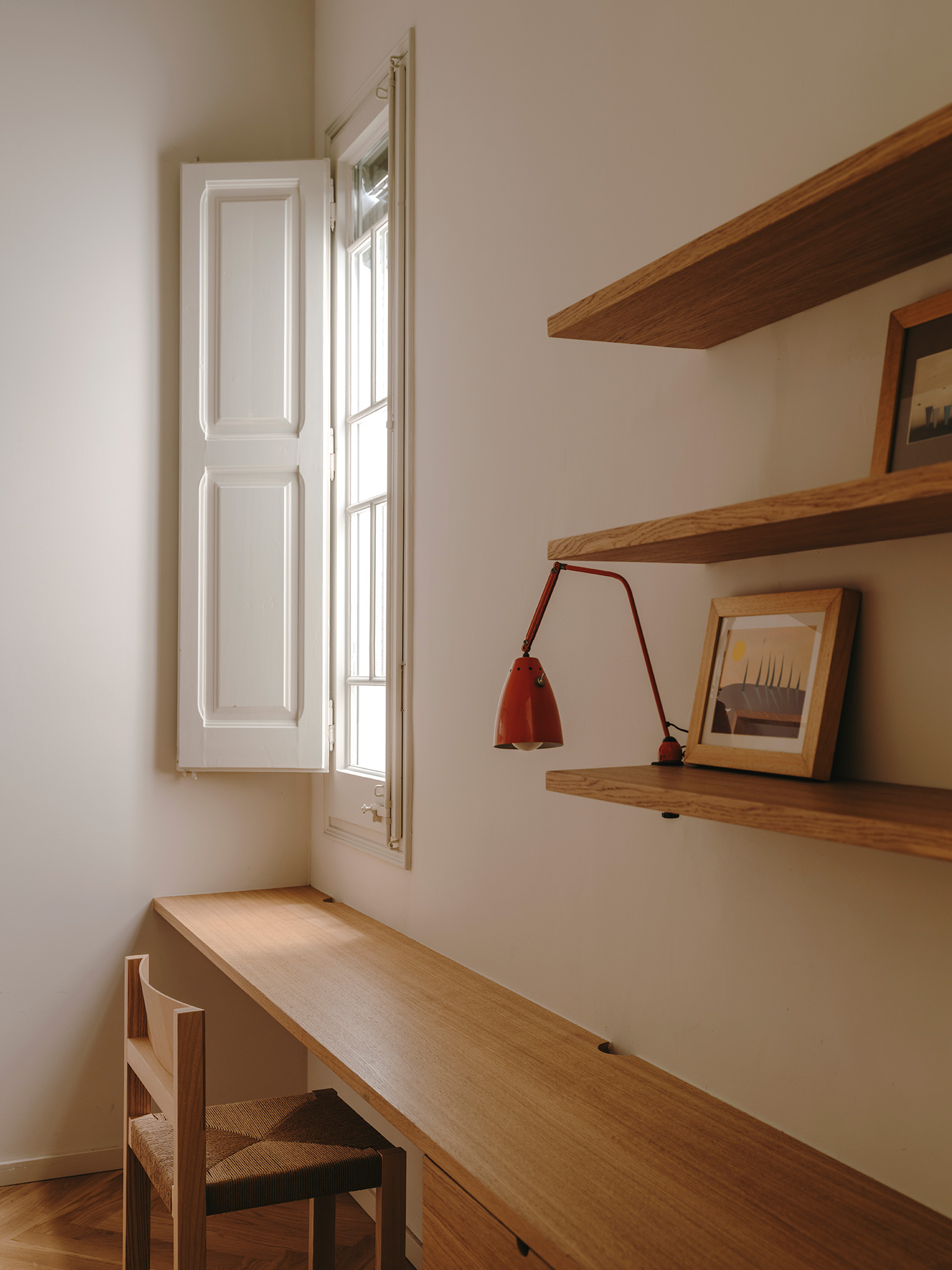 Se ubica en una zona densificada, al tratarse de una planta baja, el proyecto ha potenciado la entrada de luz natural: se han aprovechado los casi cuatro metros de altura de la vivienda, se han colocado grandes ventanales en la zona de día y el dormitorio colindante a la calle y se han creado aberturas en el pasillo, la zona menos favorecida lumínicamente.