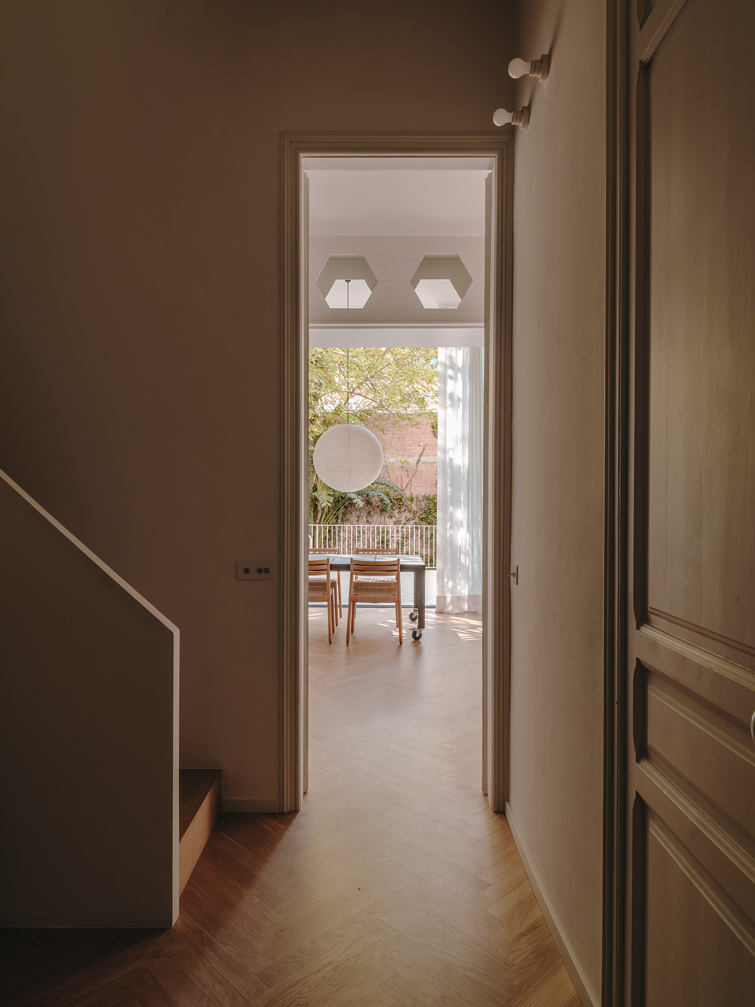 Se han aprovechando las diferentes salidas al exterior: la vegetación coge protagonismo en este proyecto; es una constante que se repite en cada una de las salidas exteriores de la vivienda, creando un recorrido verde con el jardín interior de manzana como telón de fondo. De este modo, se enlaza el patio de la entrada, a pie de calle, con este jardín, pasando por el patio de luces intermedio.