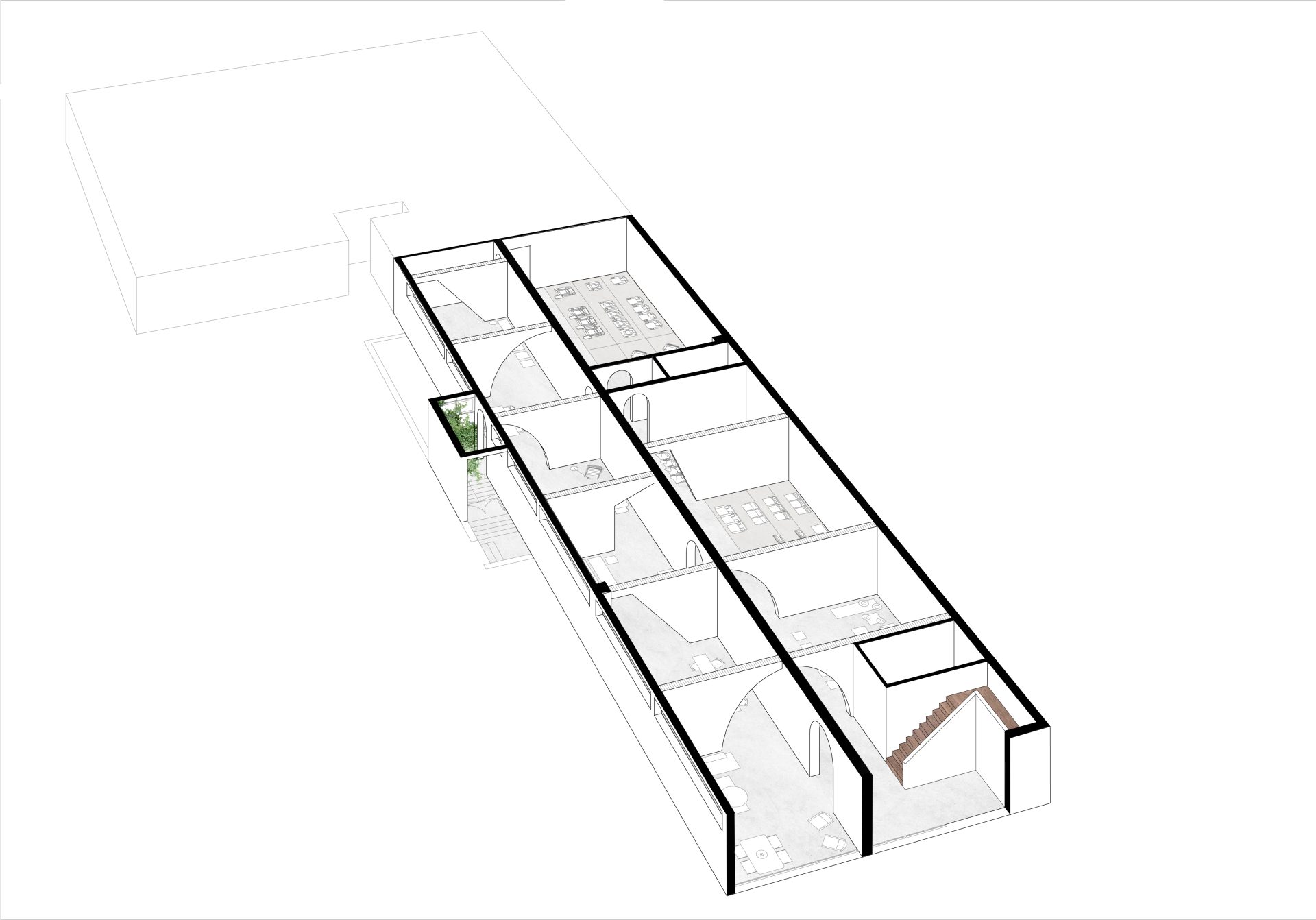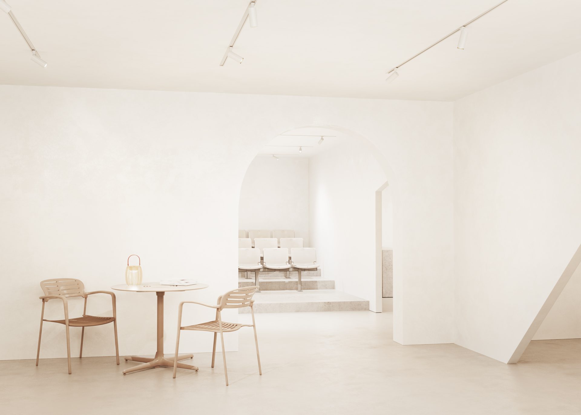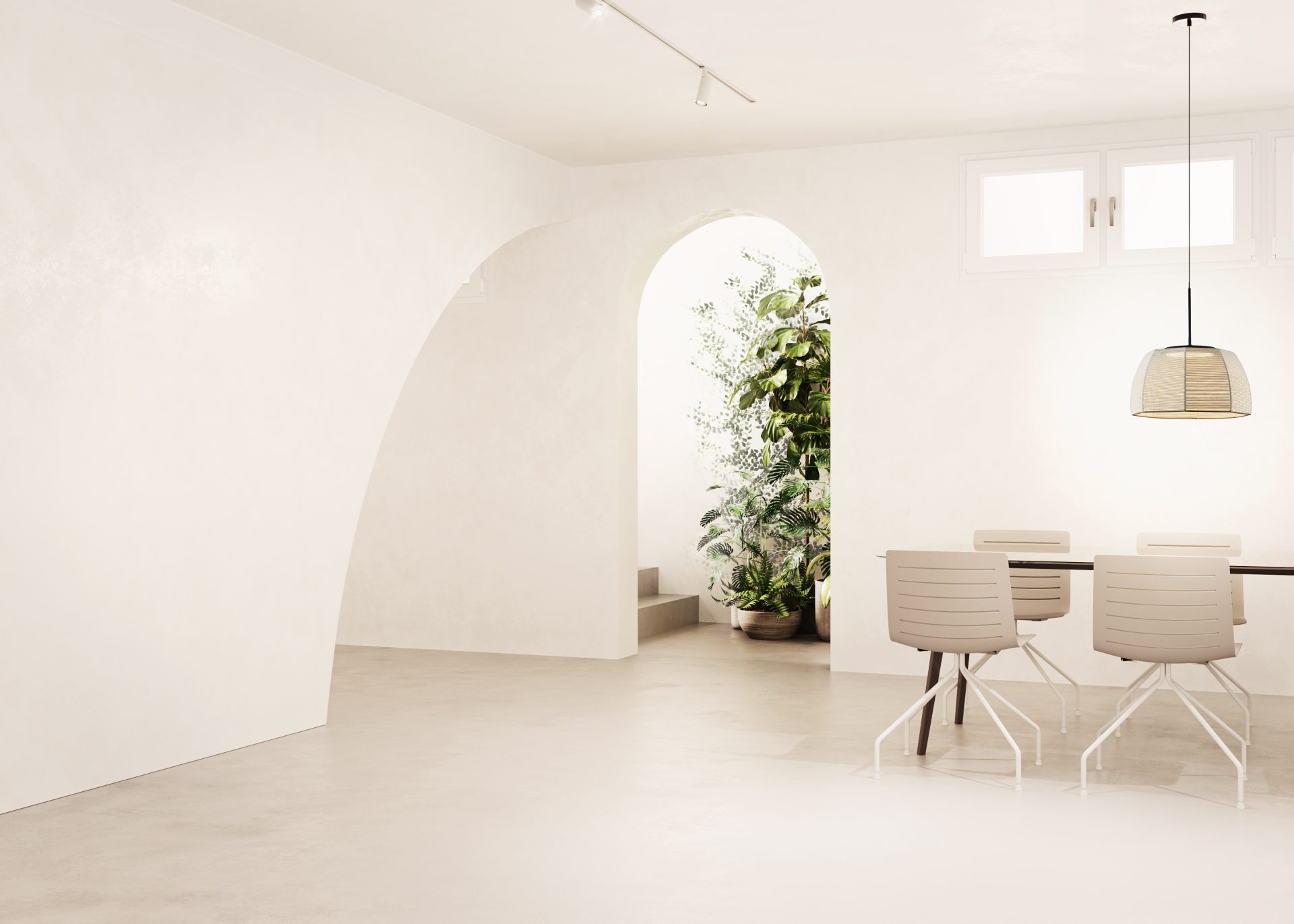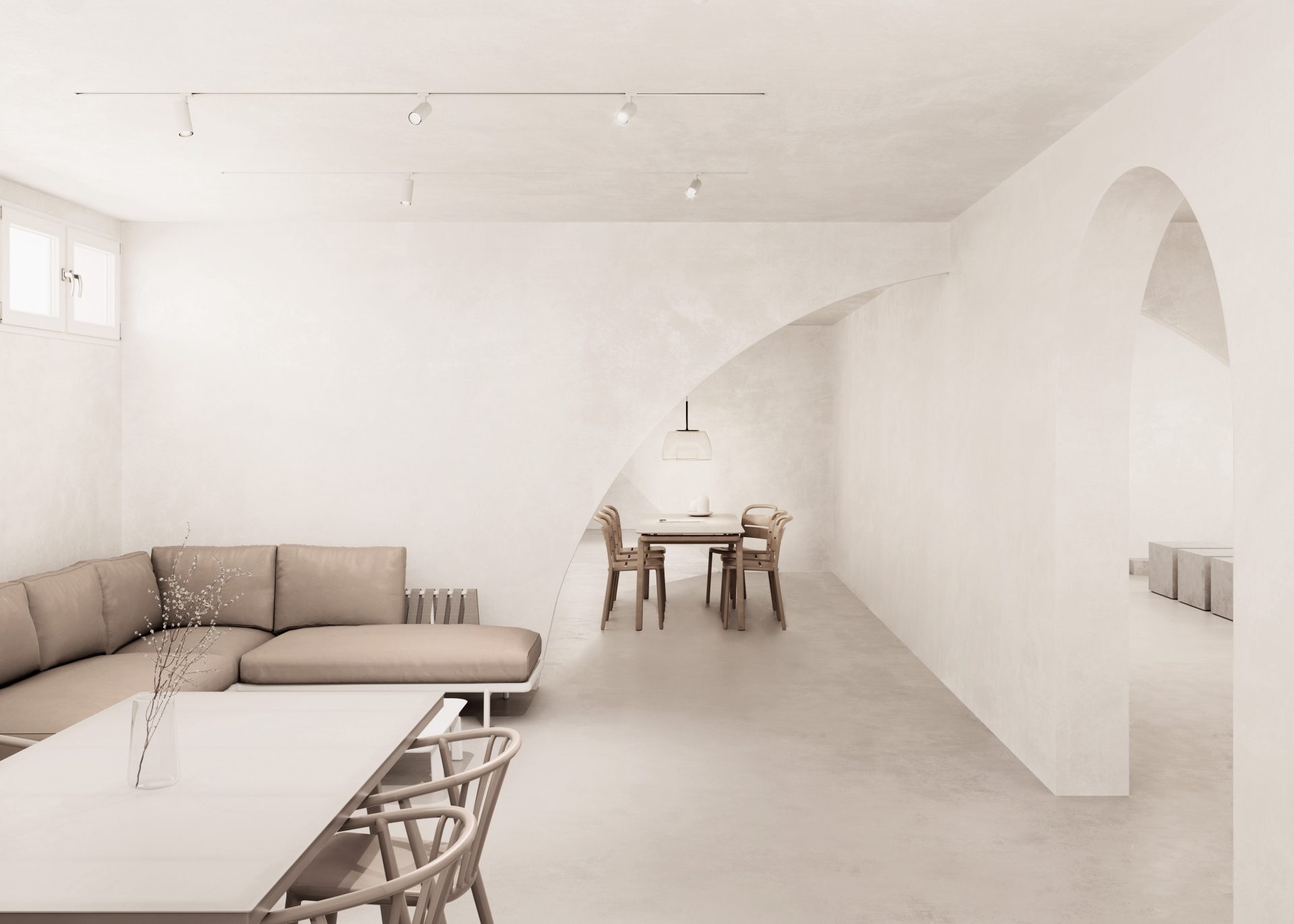 La intervención se ha centrado exclusivamente en el interior del edificio, manteniendo intacta su envolvente original, concebida como un contenedor neutro y atemporal. En su interior se ha configurado un espacio diáfano y flexible, capaz de acoger una amplia variedad de piezas y tipologías de mobiliario e iluminación sin perder coherencia formal ni unidad conceptual.